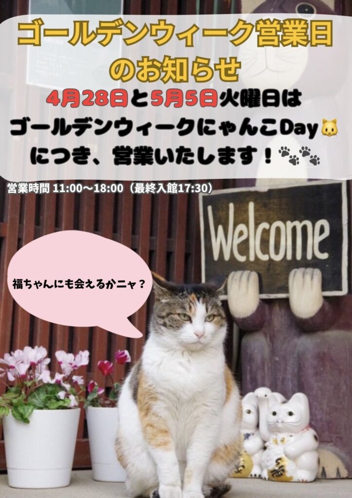 4月28日、5月5日の火曜日は、ゴールデンウィークにゃんこDay🐱につき、営業いたします!🐾🐾
