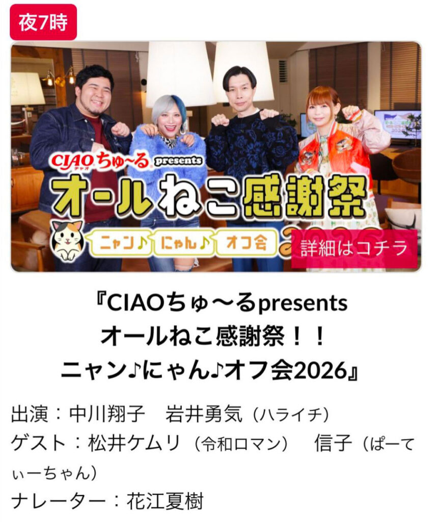 2026年2月22日(日)放送の「CIAOちゅ~るpresents オールねこ感謝祭!!ニャン♪にゃん♪オフ会2026」(BSテレ東)にて猫族歴史博物館(猫博)をご紹介いただきました。